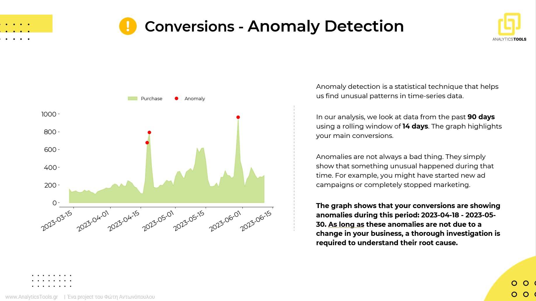 Παράλληλα, χρησιμοποιώντας πολύ εξειδικευμένους αλγόριθμους (BigQuery ML και Prophet), το Google Analytics 4 audit ελέγχει αν υπάρχουν data anomalies σε core metrics, engagement metrics και conversion metrics, ενώ καταγράφει και το ποσοστό του bot traffic στο property.