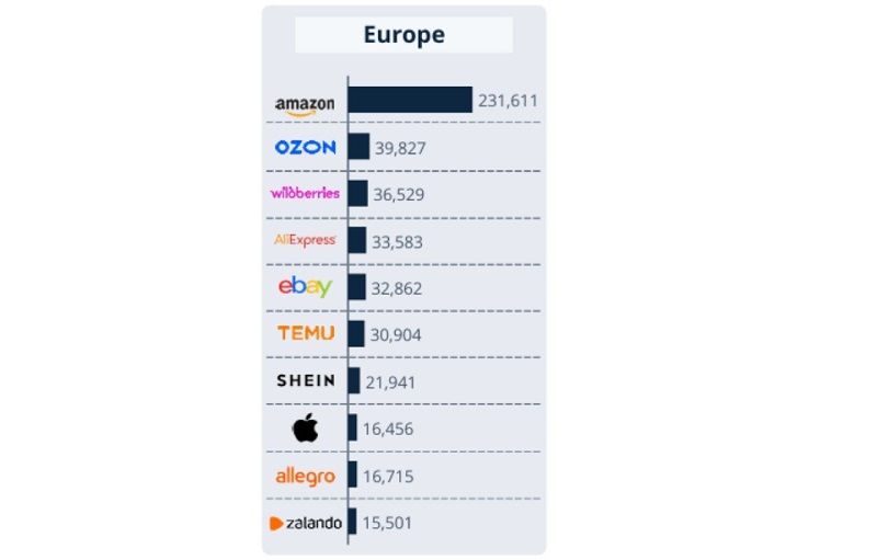 - Ρωσία: Η Ozon και η Wildberries, δύο ρωσικές πλατφόρμες, άγνωστες σε πολλά μέρη της Ευρώπης, καταλαμβάνουν τη δεύτερη και τρίτη θέση.